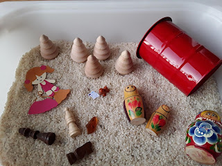 Pa seveda babuške! Kdo ne pozna babušk! Vsi smo se kot mali igrajo z njimi... Tisti temno zeleni kos mahu predstavlja tundro, lesene smrečice pa tajgo (pa so se mimogrede še to naučili - čeprav svetlolaska še vedno reče "tajda":D). Sodček pa seveda predstalja nafto in še bolj zemeljski plin, ampak ker je plin, se ga ne vidi;).